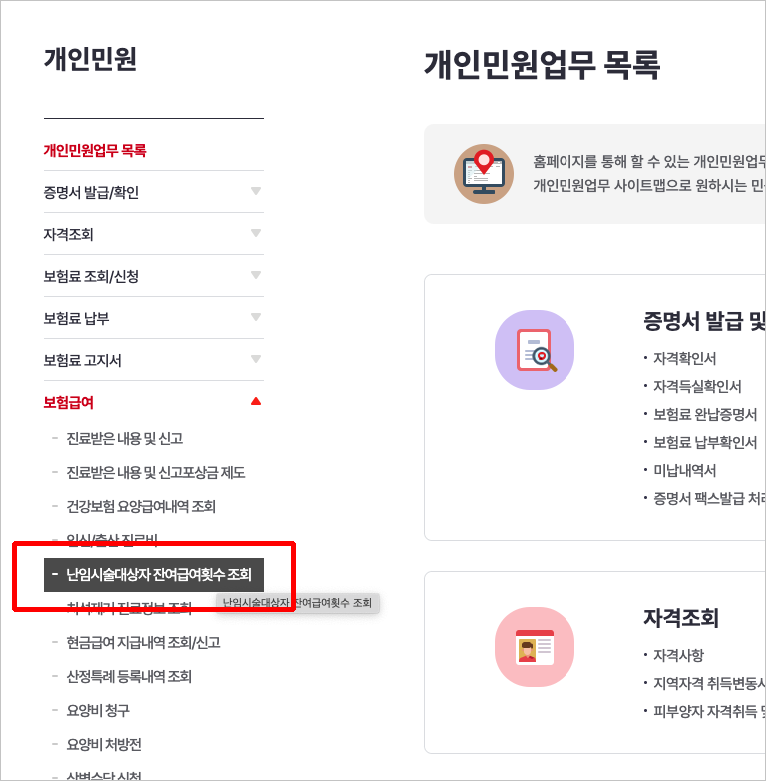 민원요기요 > 개인민원 > 보험급여 > 난임지원 잔여횟수확인